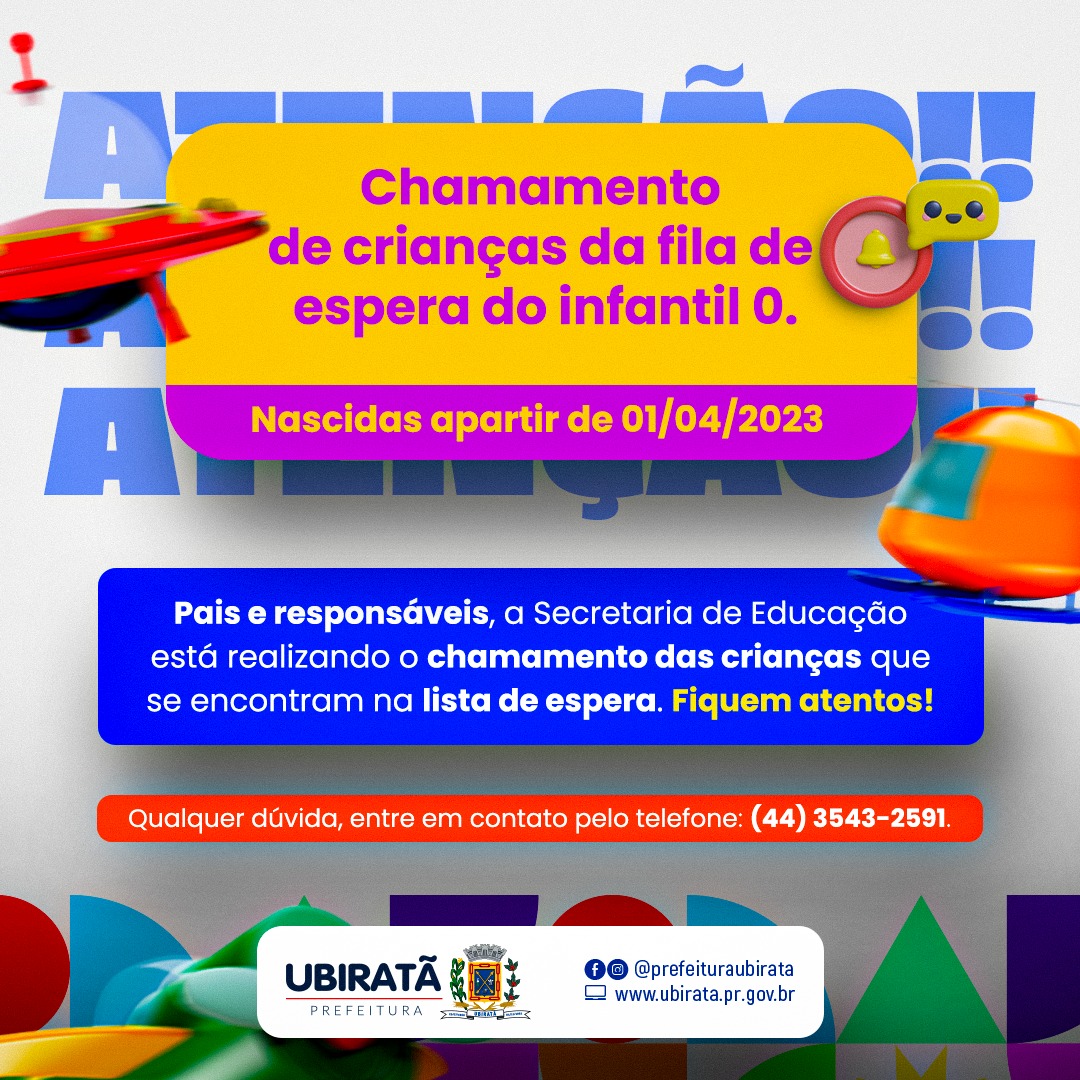 A Secretaria Municipal de Educação Cultura está realizando um chamamento especial para as crianças nascidas a partir de 01/04/2023 que estão na fila de espera para participarem do INFANTIL 0 em 2024.