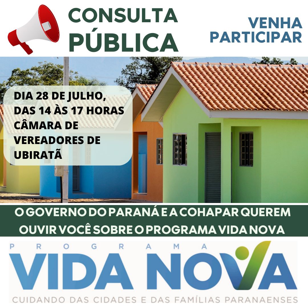 Nesta sexta-feira (28), às 14h, o projeto do PROGRAMA VIDA NOVA, coordenado pela Cohapar (Companhia de Habitação do Paraná) será apresentado na Câmara Municipal, em consulta pública realizada pelo Governo do Paraná.