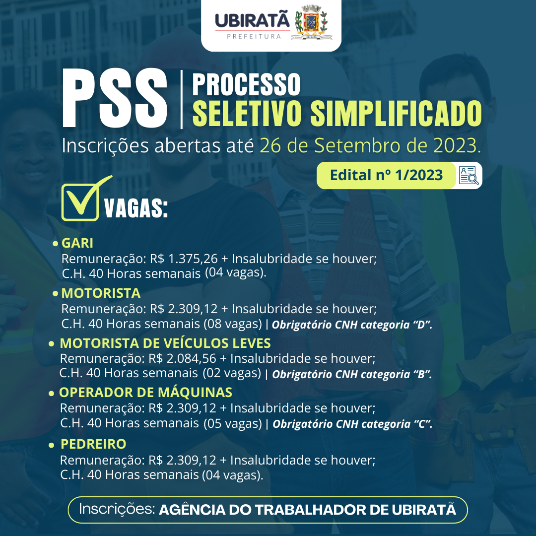 Estão abertas as inscrições para o Processo Seletivo Simplificado (PSS) 2023 de Ubiratã, as vagas são para Gari, Motorista, Motorista de Veículos Leves, Operador de Máquinas e Pedreiro.