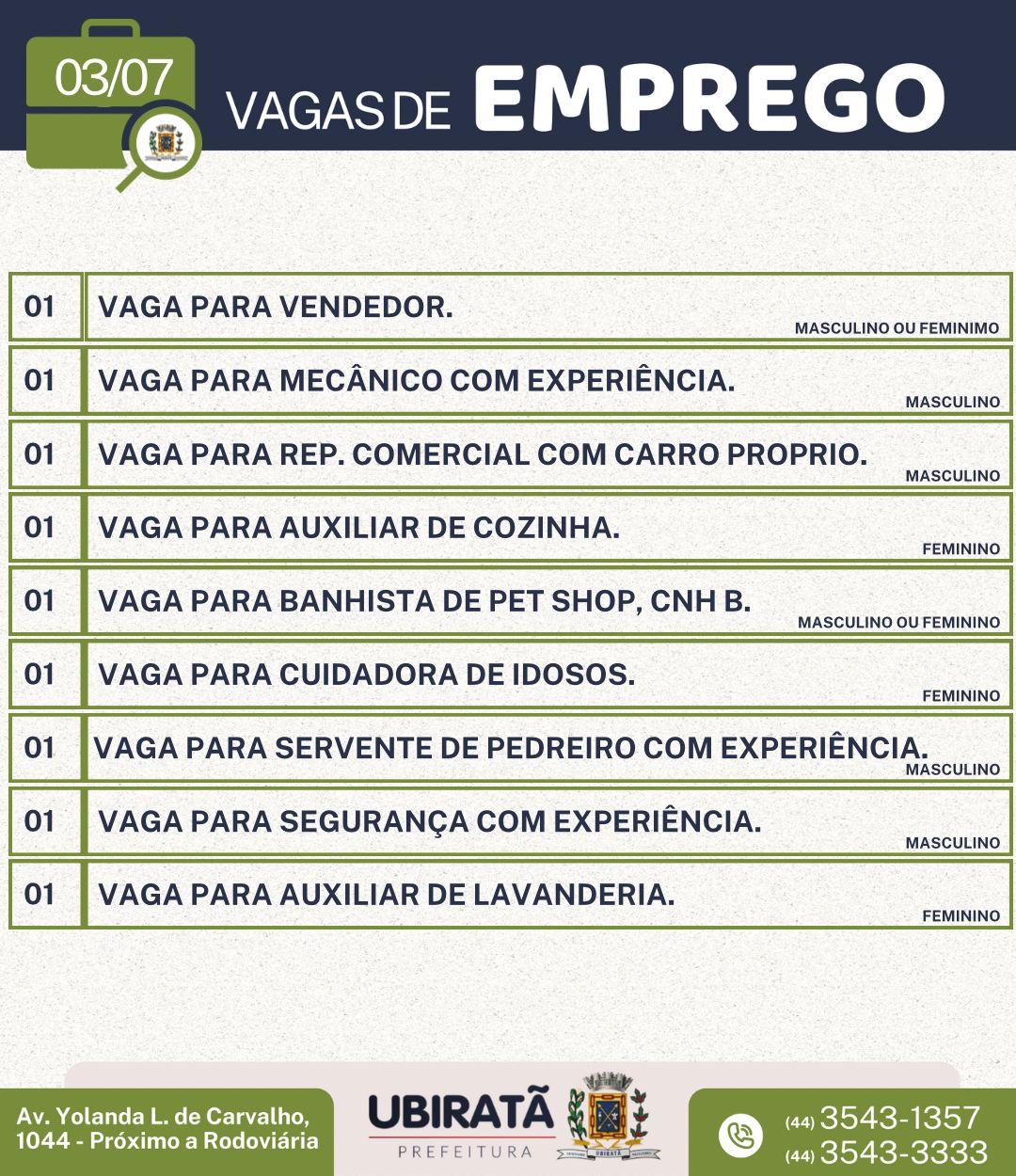 Atenção para as opções de emprego disponíveis nesta segunda-feira (03), na Agência do Trabalhador de Ubiratã.